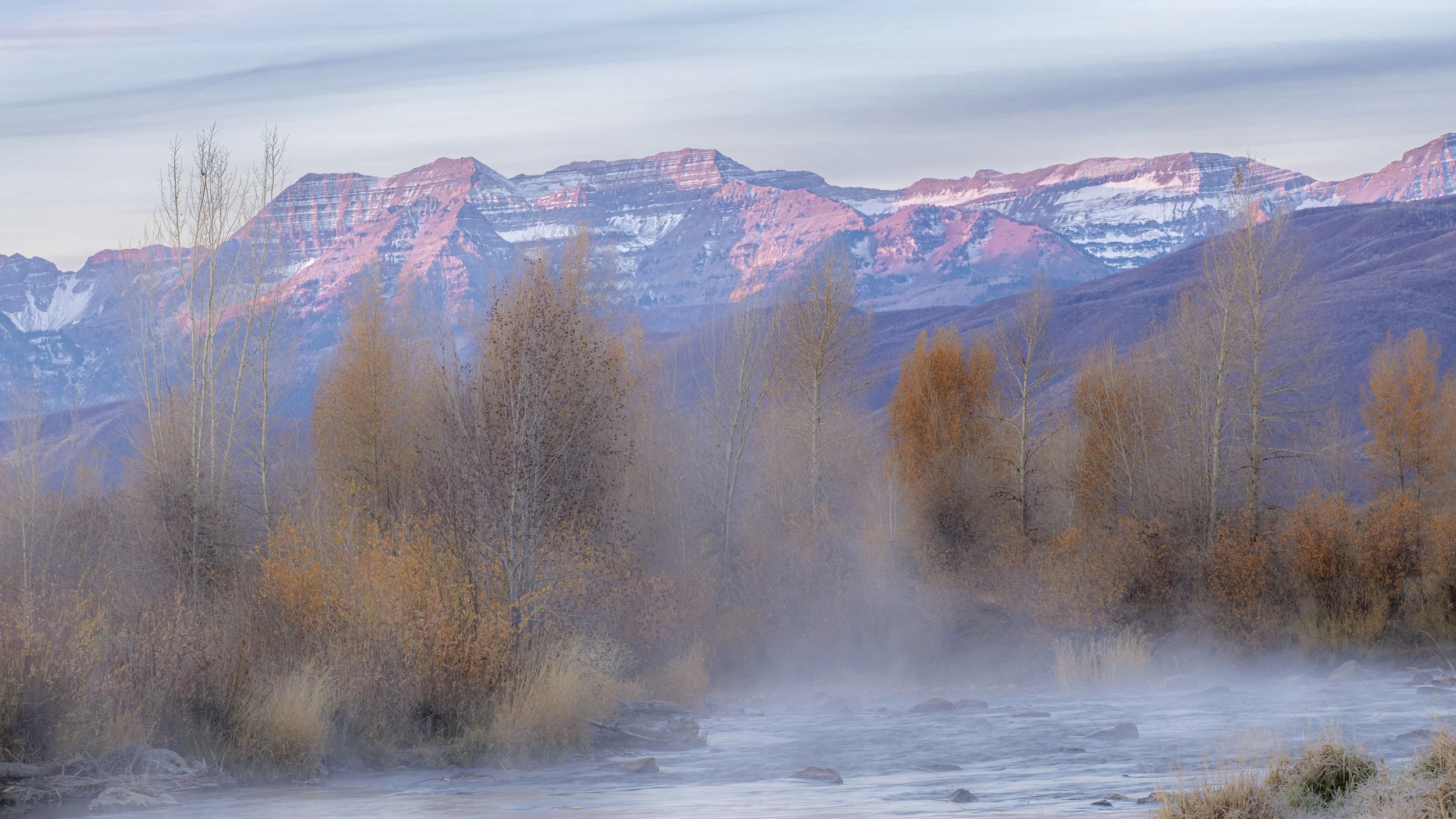 On the backside of the Wasatch Front from our area is the Heber Valley. The Provo River meanders along a wide flood plain on the edge of the valley. There is an area where the state is attempting to restore the river to its natural flow and vegetation. That area and project is called the Provo Restoration Trail. I like to visit there early in the morning, before the sun rises, and watch the first rays of light strike the peaks of Mt. Timpanogos. At this time of year when the air is cool, mist is often found rising from the water surface.